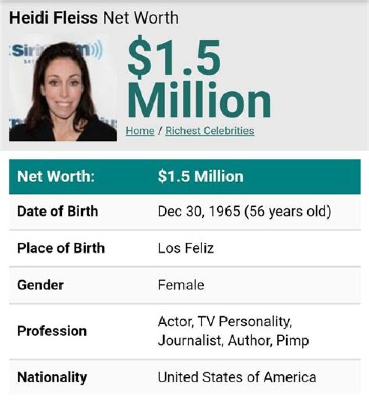 Heidi Fleiss is one of the richest Actor from United States. According to our analysis, Wikipedia, Forbes & Business Insider, Heidi Fleiss's net worth $5 Million. (Last Update: December 11, 2023)
