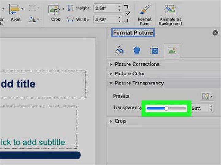 Right-click the slide and click Format Background. In the Format Background pane on the right, click Picture or Texture Fill, and under Insert picture from, click an option. In the Format Background pane, slide the Transparency bar to the right to set the transparency percentage.How do I make my background transparent?