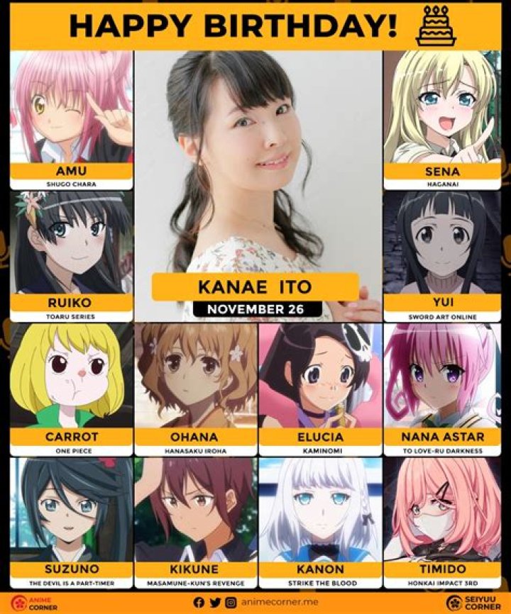 Kanae Ranked on the list of most popular Voice Actress. Also ranked in the elit list of famous people born in Japan. Kanae Ito celebrates birthday on November 26 of every year.