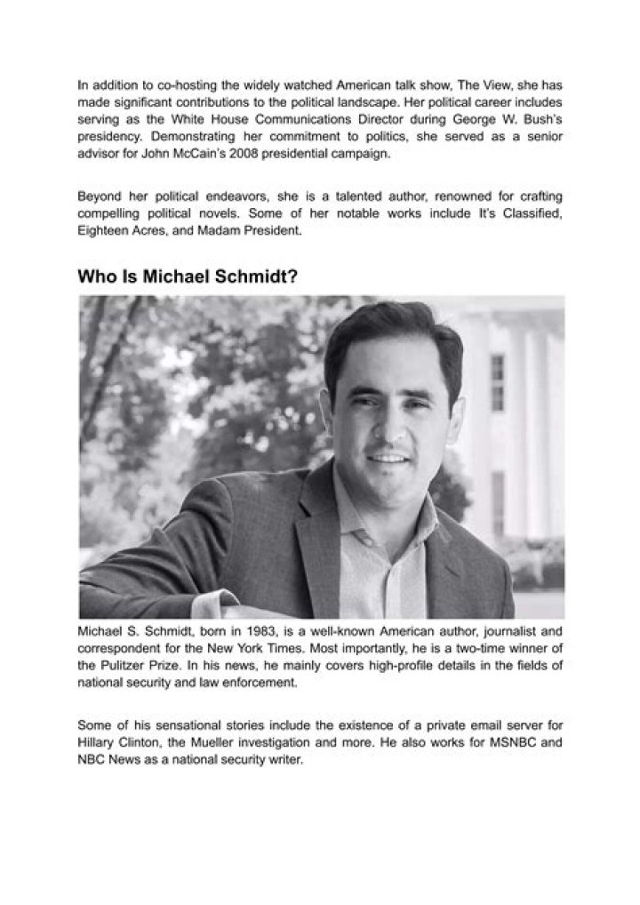 Our goal is to make our dating information precise and updated. This page was updated in January 2024 with the latest dating information and news. If you have new details about who Michael S. Schmidt is dating today, please email us.